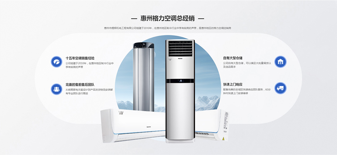 惠州市煜辉机电工程有限公司组建于2010年,在惠州地区制冷行业中享有较高的声誉,是惠州地区的格力空调经销商。一直为广大消费者朋友提供有关格力家用空调,格力商用空调等空调设计,报价,安装,维护等一系列服务